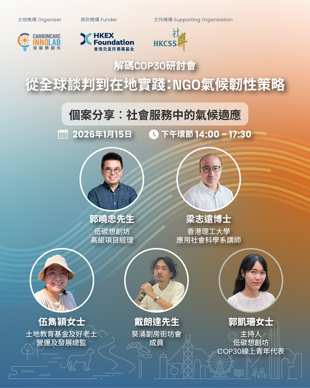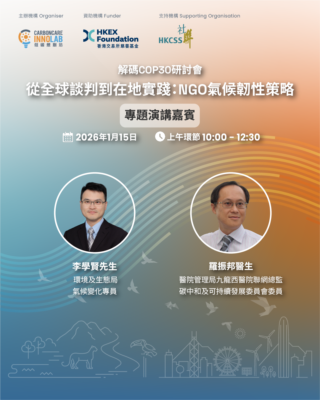 解讀 COP30 重點內容 匯報全球氣候談判的主要成果,分析對香港及社區的實際影響,為專題討論環節揭開序幕。 |