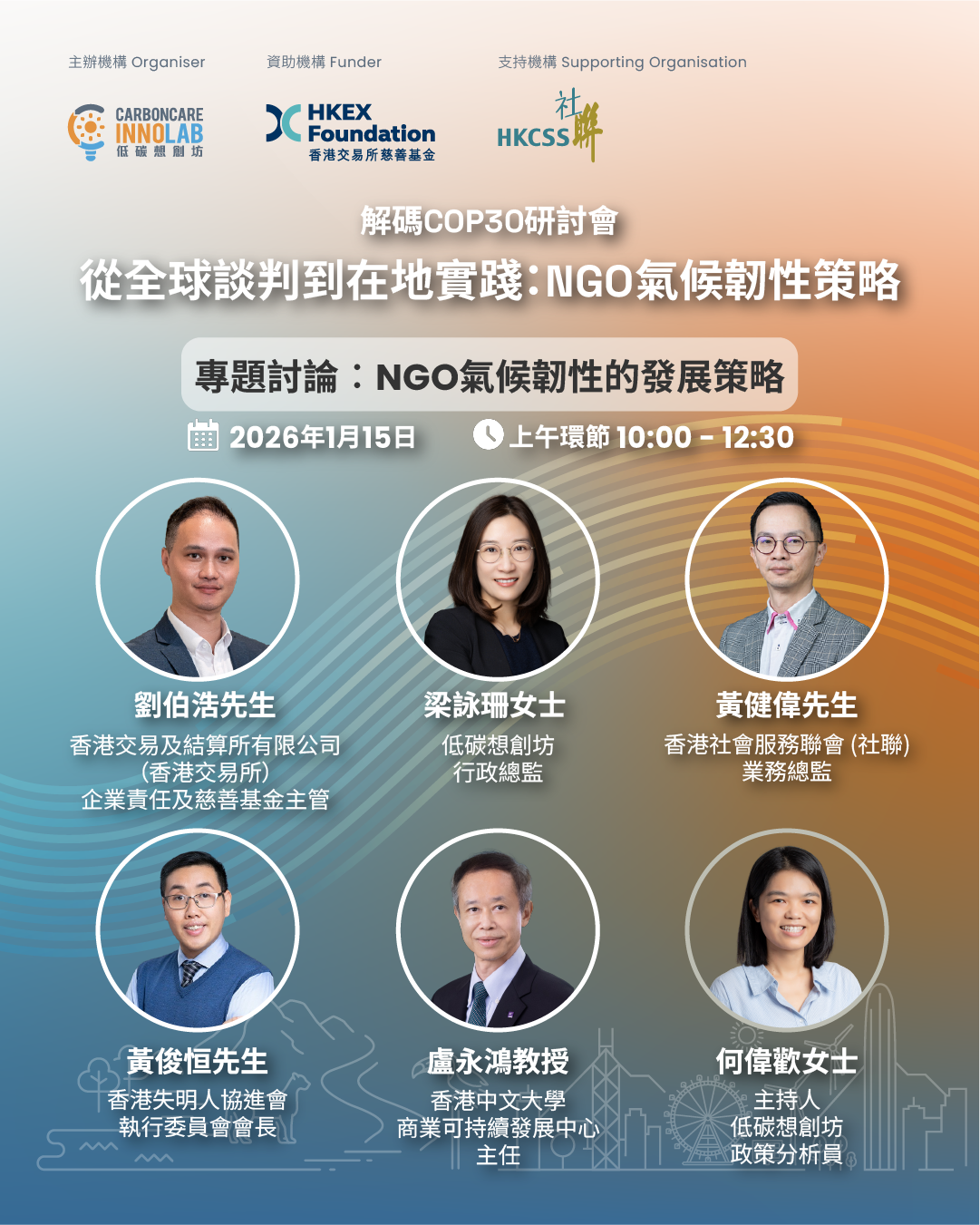 專題討論:NGO 氣候韌性的發展策略 氣候變化對NGO的日常運作及其服務社群帶來深遠影響。將氣候挑戰納入長遠規劃,並探索建立更具韌性與靈活性的運作模式,特別是在應對極端氣候風險時,顯得尤為重要。本次討論將與參與者了解全球氣候適應目標,探討如何將氣候韌性思維融入機構發展策略,幫助NGO提升應對能力,同時減少其服務社群面臨的氣候風險,共同推動社會的可持續發展及韌性未來。 演講嘉賓: