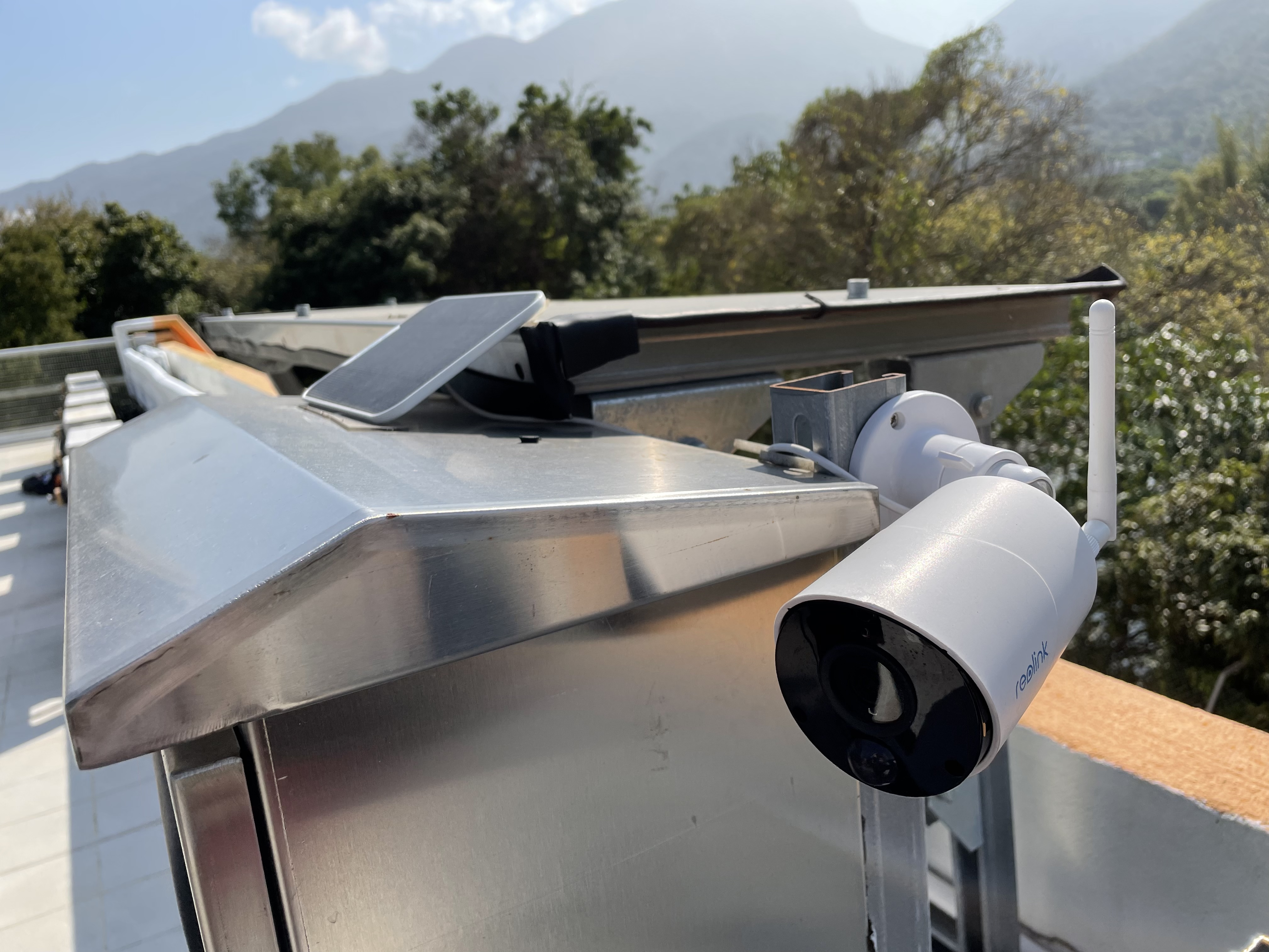 天台安裝了一部太陽能發電的閉路電視。光伏板附有電池儲電,令閉路電視在夜間或陰天時也能如常運作。
